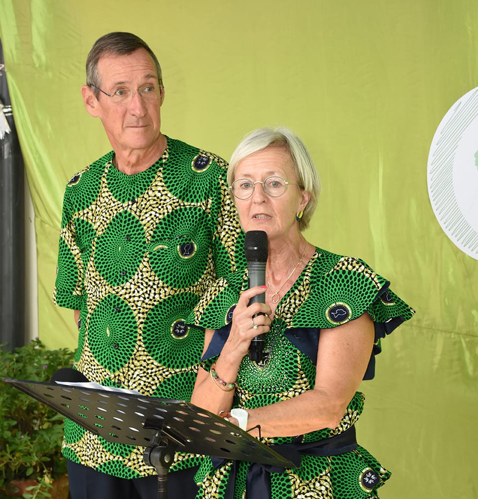 Il y a quelques années, j’apprenais l’existence de sessions de formations, de rencontres et de lieux de paroles proposées aux femmes béninoises à Cotonou. Celles-ci avaient pour objectif de les accompagner dans leur fragilité et/ou dans leur précarité dans des situations difficiles. J’ai été très touchée par l’initiative et le souci de prise en charge de femmes vulnérables. Une sensibilité profonde nous a motivés, tous les deux, Dominique et moi, à relever le défi, de concert avec les promoteurs de ce projet naissant, qui plus tard, allait s’appeler MIVO. Aujourd’hui, c’est un véritable honneur d’être présents et de soutenir ce projet de grande qualité et bien étudié. Nous sommes très heureux de participer à l’inauguration de ce lieu d’exception. Marcher dans l’espérance, nous a inspirés !